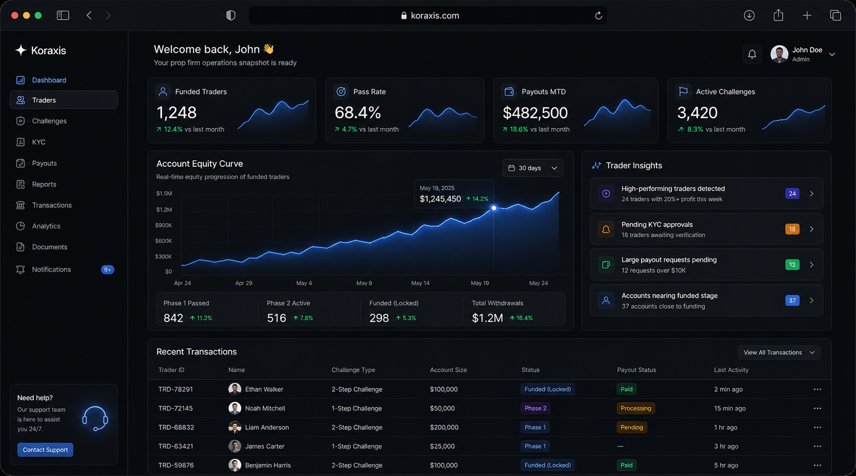 Run challenges, evaluations, KYC, and payouts on a single white- labeled trader experience built for scale.