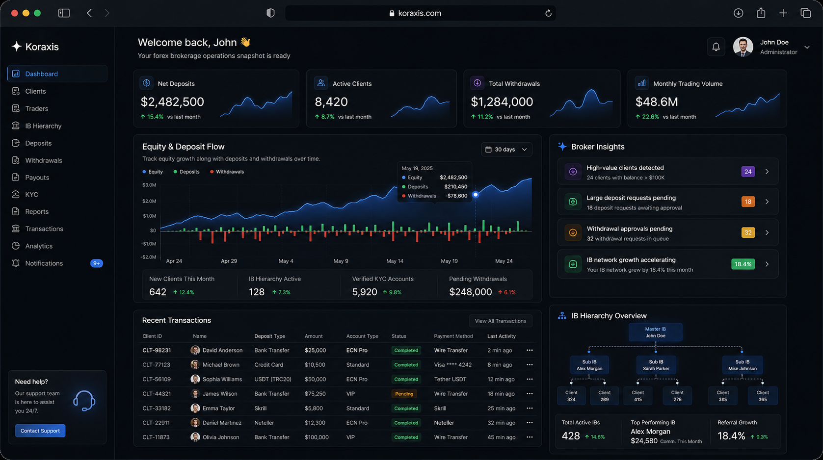 End-to-end broker operations — leads, IB hierarchy, MT4/MT5 sync, Deposits, Withdrawals, and Affiliate Reporting.